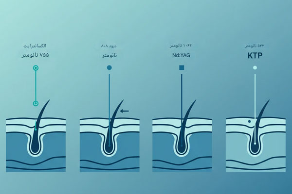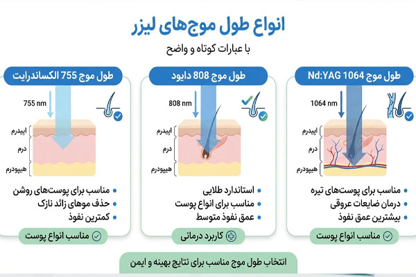 هر طول موج عمق نفوذ متفاوتی در پوست دارد: • الکساندرایت: نفوذ متوسط، مناسب برای پوستهای روشن • دایود: نفوذ عمیقتر، مناسب برای پوستهای متوسط • Nd:YAG: عمیقترین نفوذ، مناسب برای پوستهای تیره • IPL: نفوذ سطحیتر، با طیف وسیعی از نور